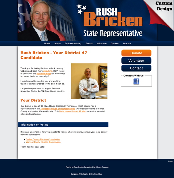 Our Lite Package features customized color schemes to select, hosting, contact forms, mail list and more. We have great default color schemes and header images that look great for any political position!
